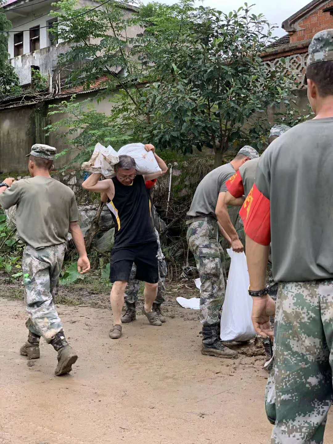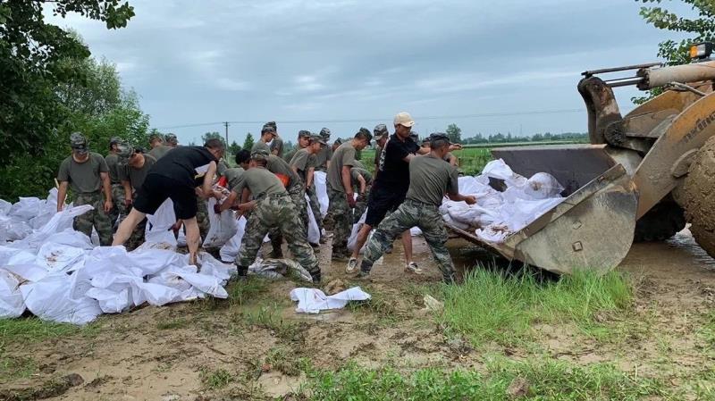 7月23號上午,在完成撤離、安置好廠區人員后,我司總經理陸鵬帶領廠區的幾位同志組建黨員先鋒隊,自發地前往小南河壩和人民解放軍部隊一起裝袋筑壩。與此同時,我司同志發揮自身技能優勢,把廠區鏟車開來助力將裝袋運到壩子上堆放,進一步提高防汛效率。