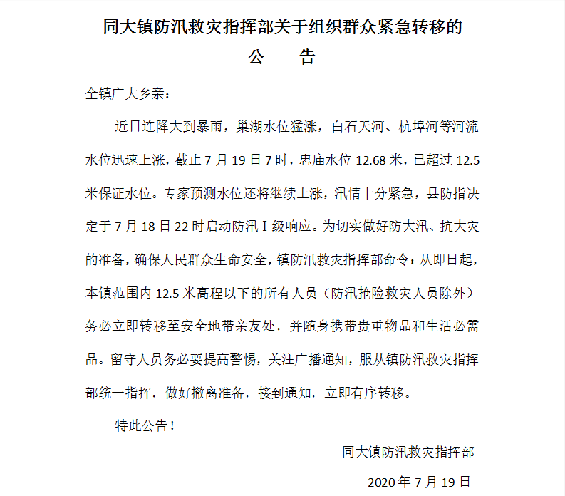 7月19日上午,我司接到同大鎮防汛救災指揮部關于組織群眾緊急轉移的通知后,立即轉移廠區人員、車輛等重要財產等。