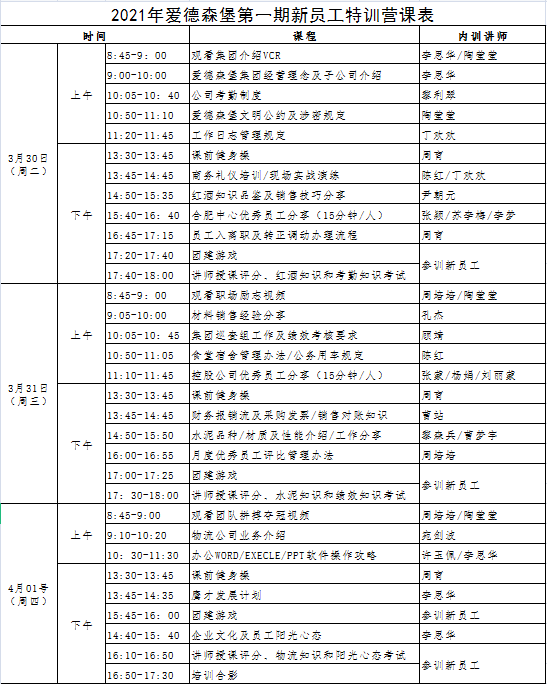 為使新員工了解公司文化,快速融入工作環境,增強歸屬感與責任感。集團行政人事部于2021年03月30日-4月01日在集團總部會議室組織開展了三天的“新員工特訓營活動”。本次培訓活動針對新員工、分享嘉賓及內訓講師通過參訓大眾匿名評分、現場互動加減分、課后知識點測評考試等多緯度評審,分別誕生了狀元、榜眼、探花等新秀及金銀銅牌內訓講師,現將成績公示如下